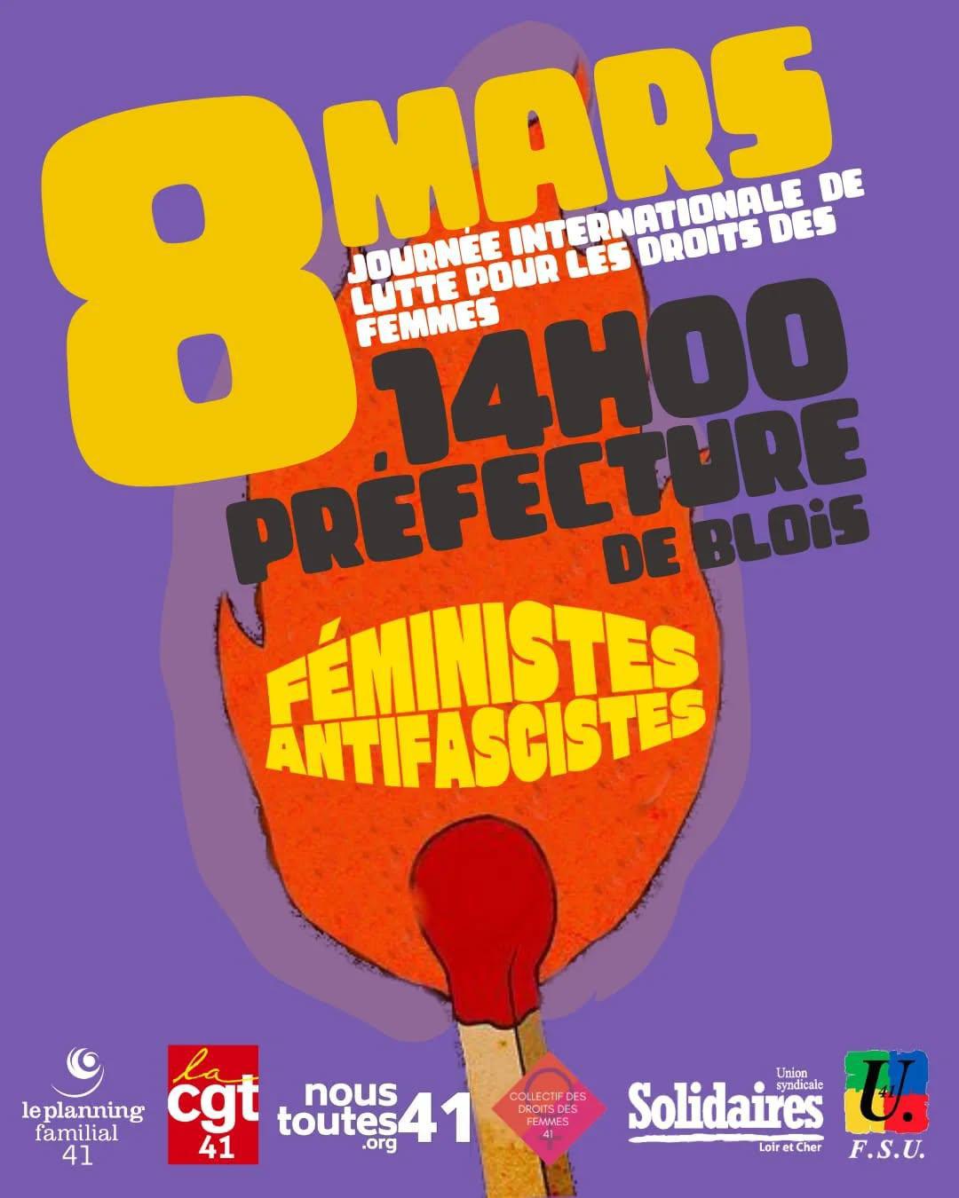 Les organisations CGT 41, FSU, 41, Solidaires 41, Collectif des droits des femmes 41, Planning familial 41 et Noustoutes 41, appellent à une manifestation le 8 mars à l'occasion de la journée internationale de lutte pour les droits des femmes.